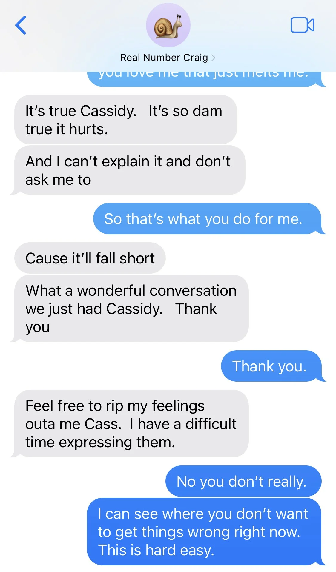 My point is that you have shown me, over and over again, that you are a kind man who loves and loves and loves. Your deep desire to honor your values—to live with integrity— is where your strength lies. The struggle for you has been in figuring out where you heart is throughout all this. Once you know that, like, really know it, that’s where you’ll be, and that’s where you’ll find your strength. I believe that you are the sort of man who can do anything., so long as you do it with integrity. I love that about you.